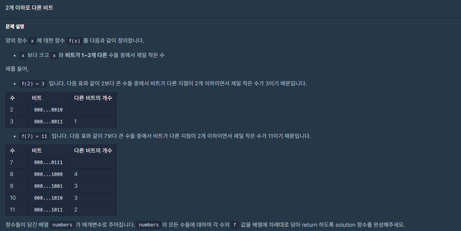 1. 만약 숫자가 짝수라면 이진수로 바꿨을 때 마지막 자릿수가 0일 것이므로 마지막 자리를 1로 바꿔주기만 하면 f(x)를 구할 수 있습니다.