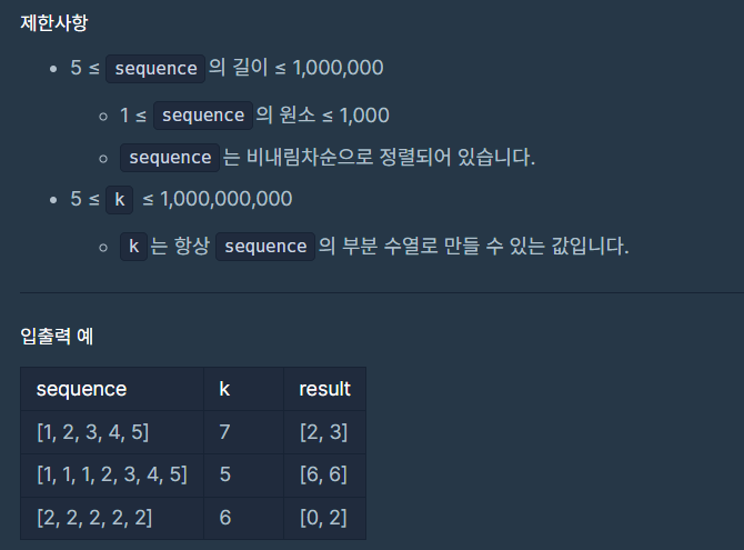 수열을 나타내는 정수 배열 sequence와 부분 수열의 합을 나타내는 정수 k가 매개변수로 주어질 때, 위 조건을 만족하는 부분 수열의 시작 인덱스와 마지막 인덱스를 배열에 담아 return 하는 solution 함수를 완성해 주세요.