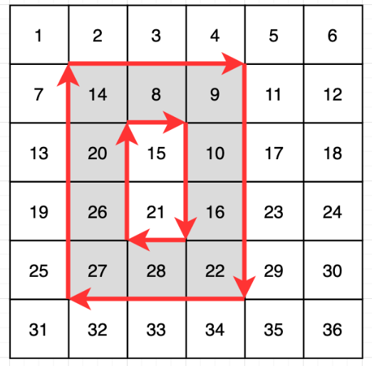 이 행렬에 (2,2,5,4) 회전을 적용하면, 아래 그림과 같이 2행 2열부터 5행 4열까지 영역의 테두리가 시계방향으로 회전합니다. 이때, 중앙의 15와 21이 있는 영역은 회전하지 않는 것을 주의하시오.