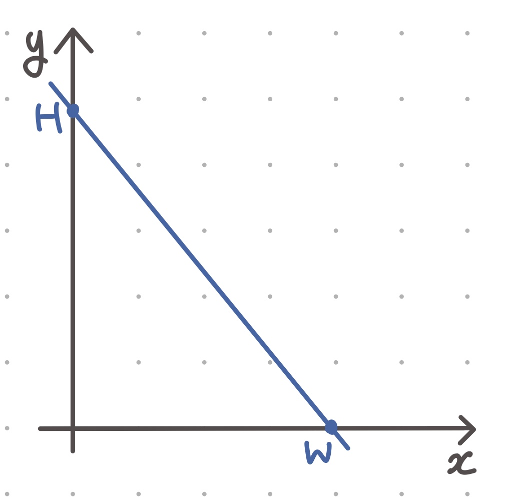 주어진 W는 x절편, H는 y절편이기 때문에 a, b를 구해줍니다.