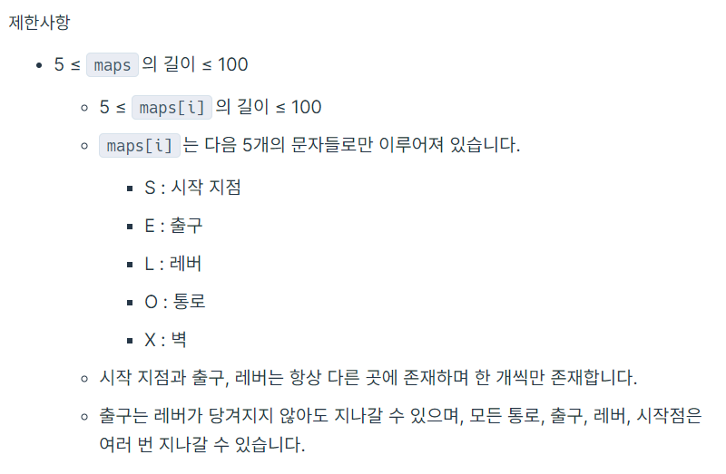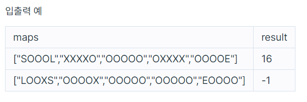미로를 나타낸 문자열 배열 maps가 매개변수로 주어질 때, 미로를 탈출하는데 필요한 최소 시간을 return 하는 solution 함수를 만들어주세요. 만약 탈출할 수 없으면 -1을 return 해주세요.