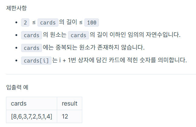 for(int i=0;i<cards.length;i++){// i: 1번 상자 그룹의 첫번째로 고른 상자.