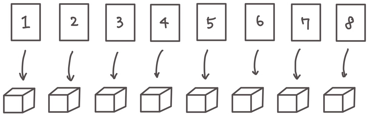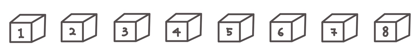 상자가 일렬로 나열되면 상자가 나열된 순서에 따라 1번부터 순차적으로 증가하는 번호를 붙입니다.