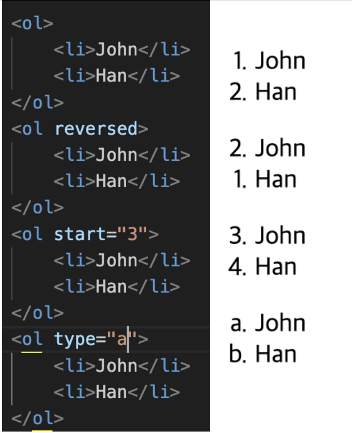 * ol은 속성 reversed, start, type에 따라 리스트를 원하는 양식으로 바꿀 수 있습니다.