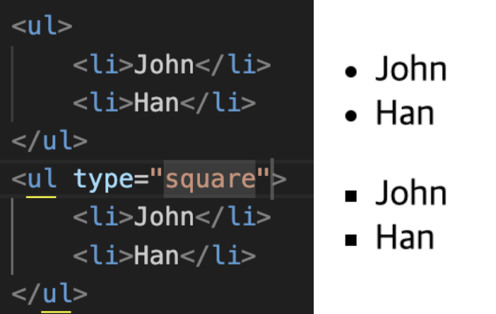 * ul은 type 속성을 square로 하면 리스트 모양이 변합니다.