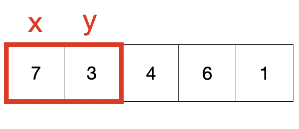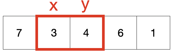 이때의 y-x는 4-3=1로 양수가 나오기 때문에 자리를 바꿔 [7, 4, 3, 6, 1]이 됩니다.