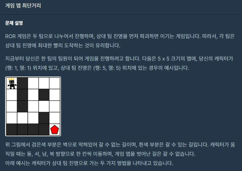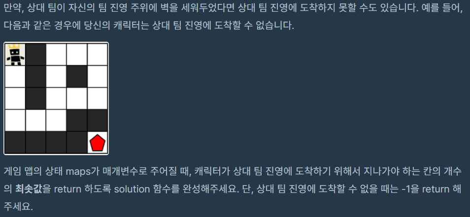 map의 해당 칸에 (이전 방문했던 순서+1)을 저장한다. - 도착지점인 (n-1,m-1)에 도착하면 bfs 를 종료하고, map[n-1,m-1]-1값을 return 한다.