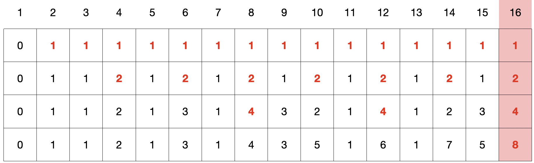 n번 자리에 들어오는 블록은 모두 (자기 자신을 제외한) 16의 약수라는 걸 확인할 수 있고,